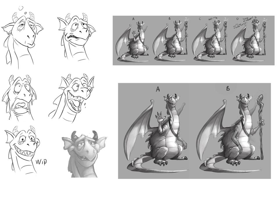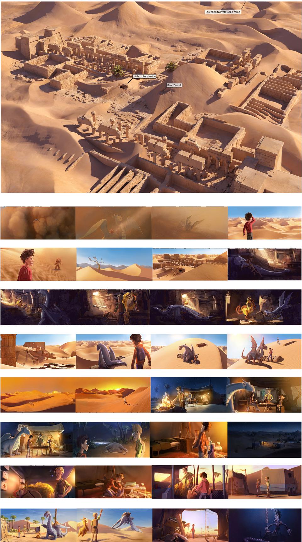 After our heroes have escaped Nettlebrand for the first time, they involuntarily end up somewhere in the middle of a hostile desert. The scenery essentially consists of three locations. A dilapidated, ancient Egyptian temple complex in the style of the double temple of Kom Ombo, the tomb below where our heroes meet the basilisk and the oasis where the professor has set up a camp with his mythical creatures.The whole setting is strongly stylized. The temple complex is unusually located in the middle of a sea of dunes that stretch like an endless sea to the horizon. No civilization far and wide. This is intended to make the hopeless situation of our heroes even more clear. Strong ocher / brown tones dominate, which should contrast with the azure blue sky.