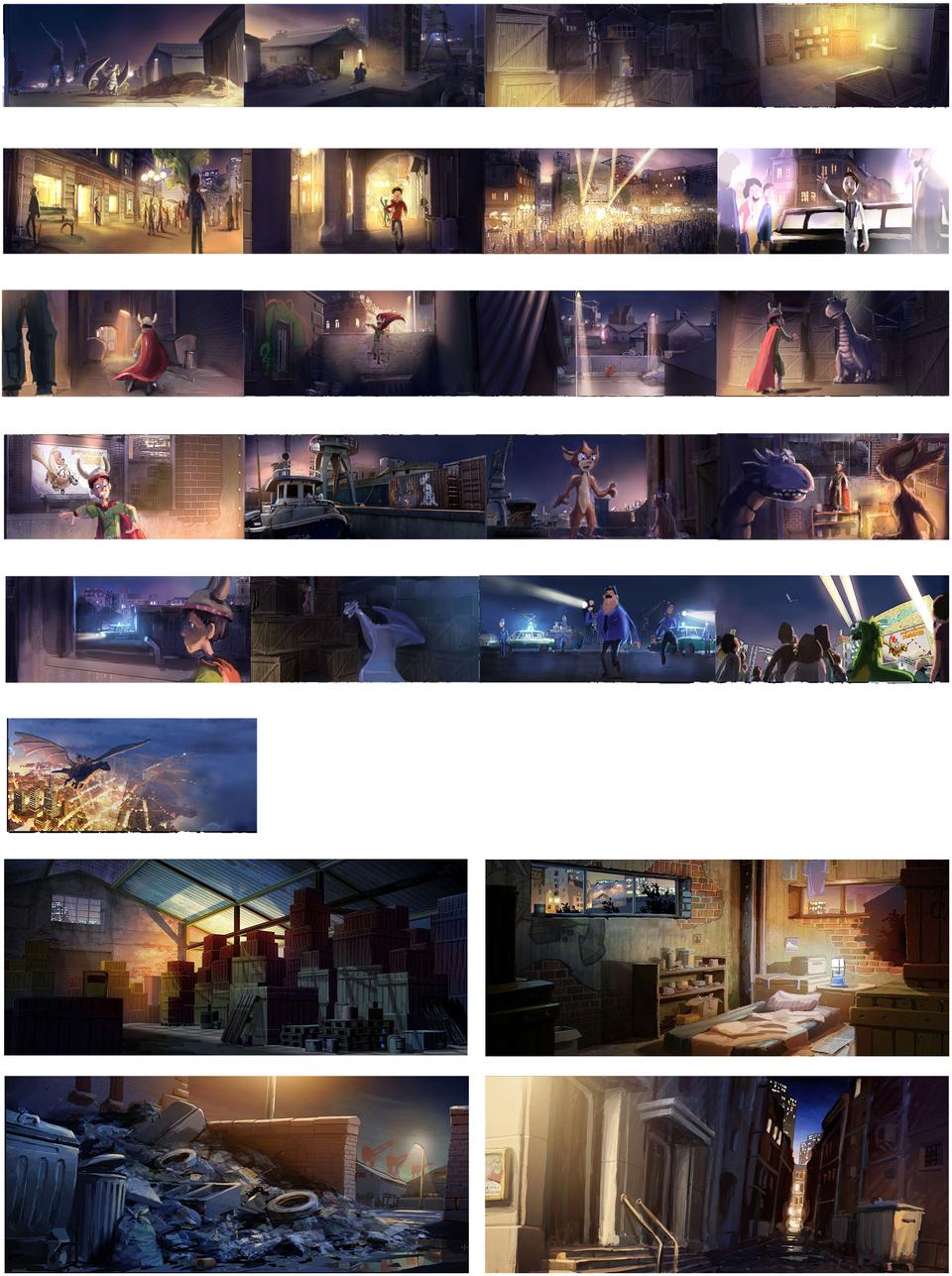 According to the script, the second set takes place in a German city by the sea. Here, too, there is no more precise information about which city is actually involved. All of the scenes here take place at night. There are two places that had to be designed. One is the harbor with an old warehouse, where Firedrake and Sorrel meet the orphan boy Ben for the first time; it is an abandoned part of the harbor, hazy and eerie. Blue-green and yellow-red shades dominate here. The other scenes take place in the city and especially in front of the premiere cinema, where Ben steals the knight's costume to escape his pursuers after he stole a necklace from a jeweler. The architecture is said to be primarily shaped by the historicist building that was common in the 19th century; but also the architecture of post-war modernism, which changed the German cityscape after the reconstruction, are included in the design concept. The architecture of the cinema is based on the newly designed building of the Zooplalast by Paul Schwebes. In contrast to the curved lines that are usually found in animated films, the formal language is strict and straightforward. In terms of color, the blue of the night is broken up by the complementary, amber-colored lantern and shop window light.