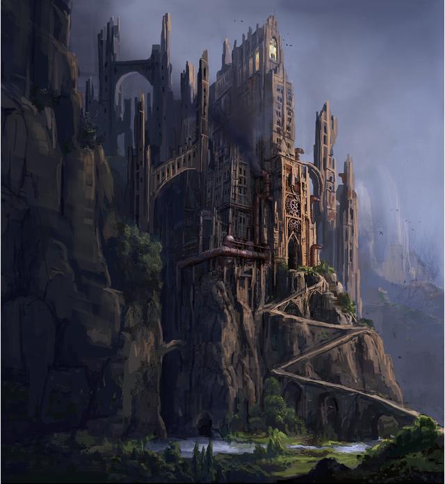 In this set, the antagonist Nettlebrand and his helpers are introduced for the first time. The scenes there take place outside in a mountain range and in a forest on a hill, where our heroes land, and once inside the castle of Nettlebrand. The whole scene is supposed to appear mystical, ghostly and, in keeping with the dwarf characters and the homunculus Twigleg, in an ironic way reminiscent of the black and romantic imagery of the Nibelung saga. Nettlebrand's castle, whose Gothic, sacred architecture is supposed to be reminiscent of the neoclassicism of a Neuschwanstein, sits enthroned in front of a mountainside like an ominous threat. This architecture is broken up by steam engine-like elements that are supposed to make the building appear like a living monster. This scene also takes place at night. In order to stand out from the cityscape and to support the mystical atmosphere, the light should be given a surreal character by means of light gobos. Fog and autumn leaves also support this atmosphere. The hall in which Nettlebrand resides is reminiscent of a sacred nave that has been badly damaged over the years. Here, too, style elements similar to steampunk are installed everywhere, which are intended to illustrate the transformation of the building by the magician Pestrosius.The dungeon halls in Nettlebrands Castle are intended to illustrate the size of this building once more. The fantastic representations of the dungeon halls of Piranesi served as a model.