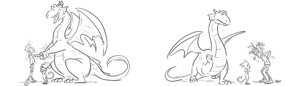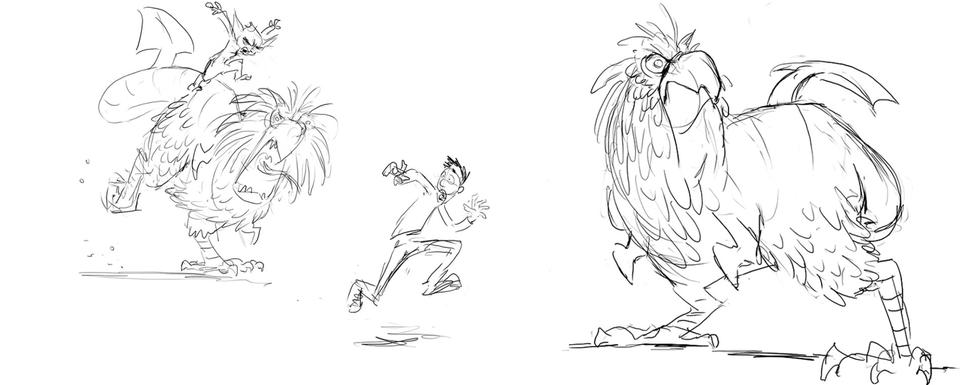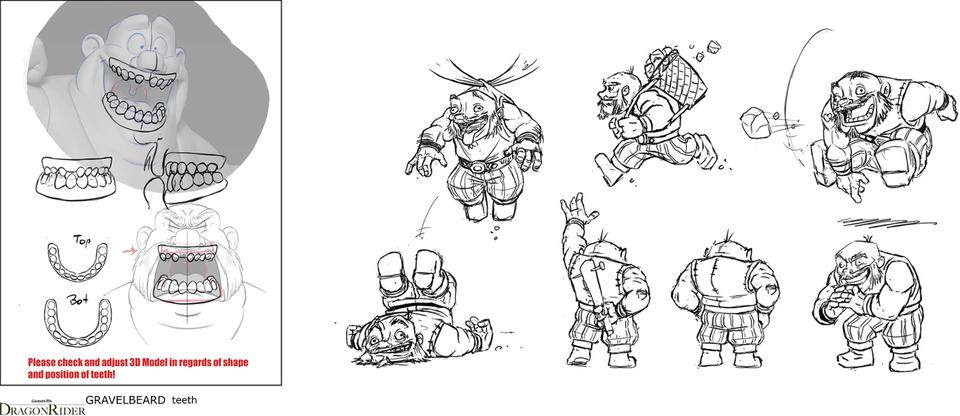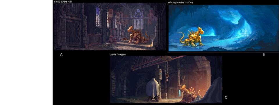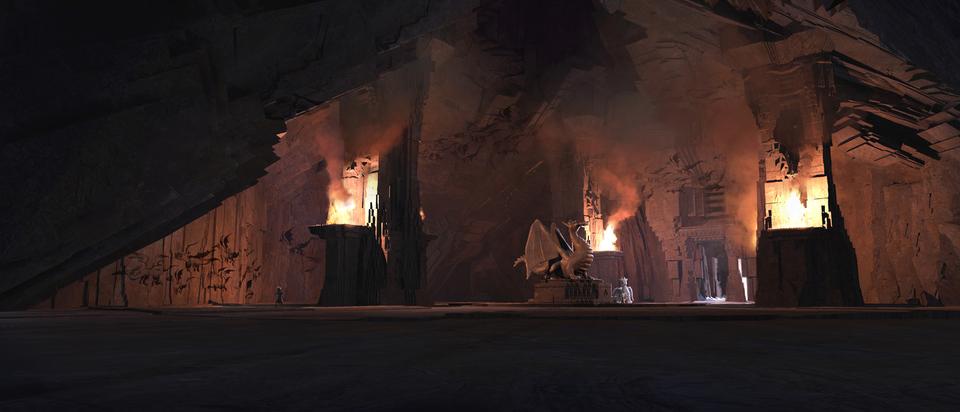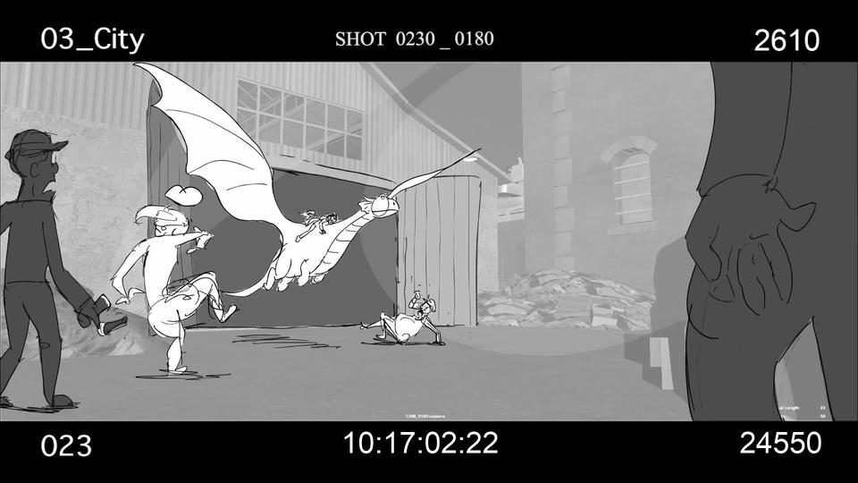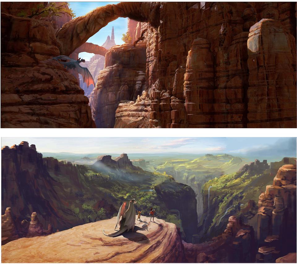After the arduous odyssey through world history, our heroes land on a barren stretch of coast. Here Sorrel is kidnapped by a huge bird of prey and an action-packed chase begins. Right from the start, the set was designed as a kind of natural obstacle course. Since the bird of prey is reminiscent of a giant bald eagle, the decision to design the set in the style of the Grand Canyon in Arizona was only an obvious one. The challenge for the layout artists was to design the chase in such a way that the viewer gets the feeling of flying higher and higher until Sorrel plunges into the depths at the highest point to be rescued by Firedrake just above the bottom. For this purpose, a library of modular layout geometries of the rock formations was built, which could be moved as desired. The reddish-brown rock formations stand in stark contrast to the colors of the following set.