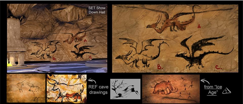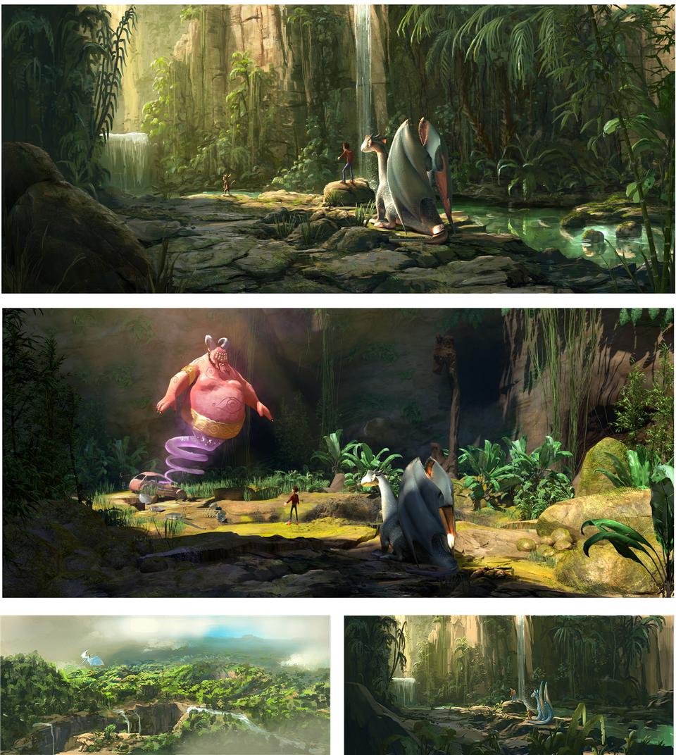 The Valley of the Dragons was challenging in many ways. On the one hand because most of the places are played here, on the other hand because it should actually be an uncomfortable place that the dragons want to leave, but there should also be scenes in the film that suggest a certain cosiness. In the book it is assumed that the valley is located in more northerly regions. Since these are mostly bare and if wooded, then only with conifers, it was especially difficult to tell the home of the brownies. Because these small, cat-like creatures build their caves in the cavities of trees, which was simply better designed with gnarled deciduous trees than with the straight, columnar trunks of the Nordic spruce. Swamps also appear in the script and so in the end the valley became a place that cannot be explicitly assigned to an existing country. The valley is most likely to be associated with British Columbia in western Canada, which has both arctic and warm temperate climates. The color spectrum of this set is dominated by cold green, turquoise and blue tones.