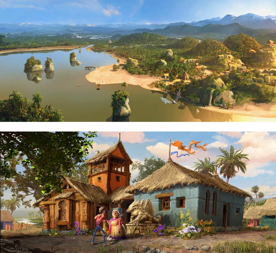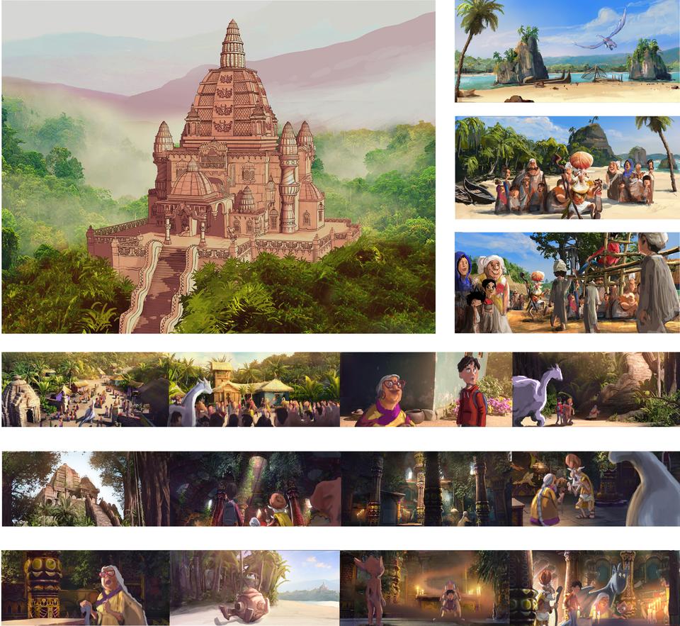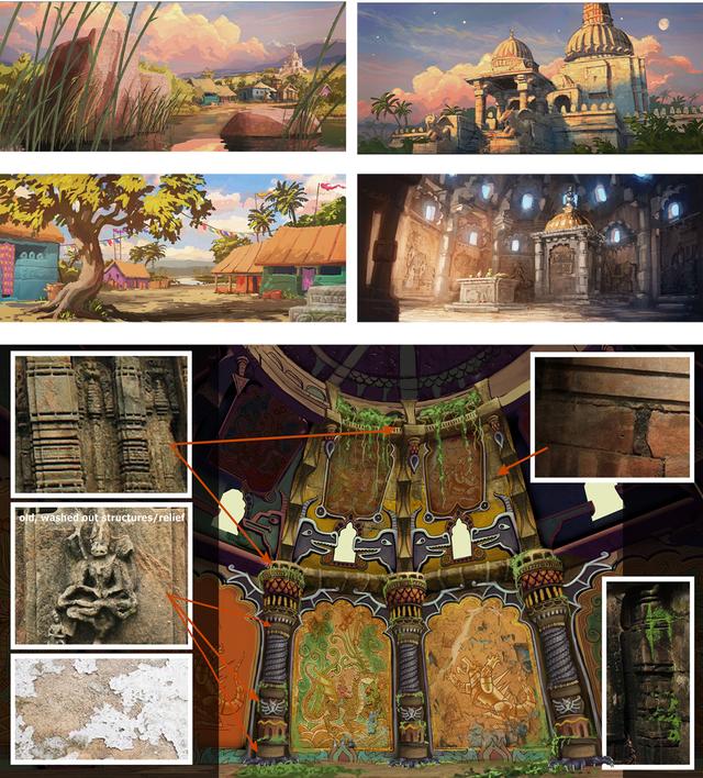 After narrowly escaping the dangerous Djinn, the heroes continue their journey to India. In a bay they head for the village where the seer Subisha Gulab lives. The temple in which the story of the dragon rider is told is enthroned high up on a hill. With its vegetation, the bay is reminiscent of Kerala in the south-west of India. Conceptually, the village should look poor and improvised, but with its brightly colored colors it should set itself apart from all other sets, especially the very monochrome Himalayas set that followed. The architecture of the Dragon Rider Temple is based on the style of Hindu buildings of the 10th and 12th centuries, with its classic tower structures consisting of the slightly curved temple tower Sikhara and the underlying, separated Garbhagriha, in which the sanctuary is located.
