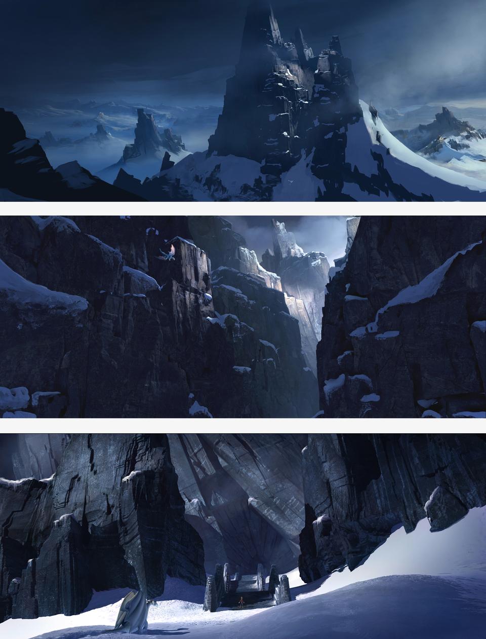 The last part of their trip takes place in the Himalayas Mountains. Stylistically, things come full circle here. The inhospitable and cold environment corresponds to the atmosphere that the Dragon Valley is supposed to suggest; rather, it seems to be even more hostile to life. Dramaturgically, a retarding moment is created here, in order to allow the audience to immerse themselves in the hopeful and fantastic landscape of the Rim of Haven after the action-packed showdown. The angular, crystal-like, almost black rock formations protrude into the sky like pointed fingers and are highlighted in contrast by the soft, cyan-blue snow banks. To escape a snow storm, our heroes take refuge in a gigantic crystal cave. The idea of telling a surreal space here once again allows the real and metaphysical world to merge further. The gate to the hall where the showdown takes place is high up on a gigantic, crater-like mountain peak. The architecture in the hall with its geometric columns composed of many small cuboids draws its analogy from the rock formations and thus looks like a part of the mountain itself; ancient and out of this world. After the magical secret exit in the hall has opened, our heroes step out and enjoy the vastness and freedom of the Rim Of Heaven. For a brief moment a place of hope is revealed to the viewer. Lush green meadows and gentle valleys; crystal-colored waterfalls and colorful flower borders; everything is embedded in a soft sea of clouds, which is supposed to protect this magical place from intruders like a gigantic barrier.